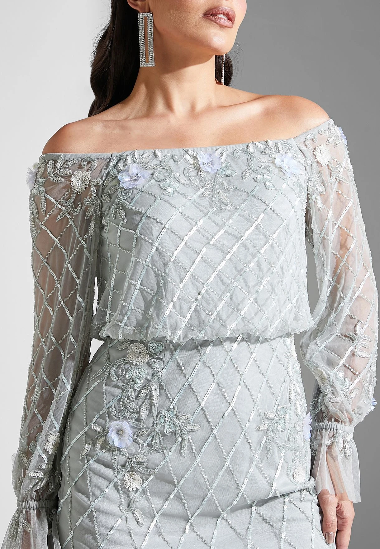 A sophisticated off-the-shoulder cocktail dress is adorned with sparkling handsewn beadwork in a diamond and floral pattern. The iconic blouson bodice is perfect for a flattering, comfortable fit and feel. Sheer illusion long sleeves with bell cuffs.