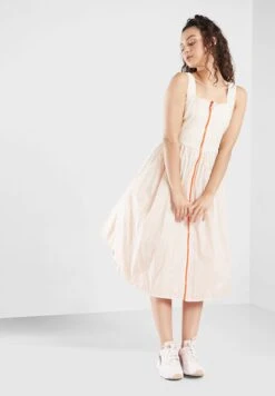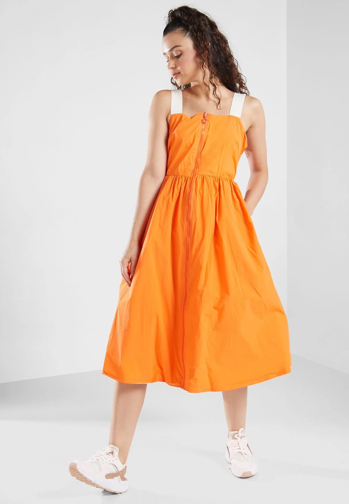 Our reversible, zip-through volume dress adds a feminine edge to any outfit. The fabric is 100% recycled crinkle nylon. This unique design allows you to style it as a dress or layer it over leggings and a top and wear as an open jacket. Our reversible dress will transition through the seasons providing two colour options for a colour update to any wardrobe. Branded elasticated tape at the shoulder straps gives this style a sportswear edge.