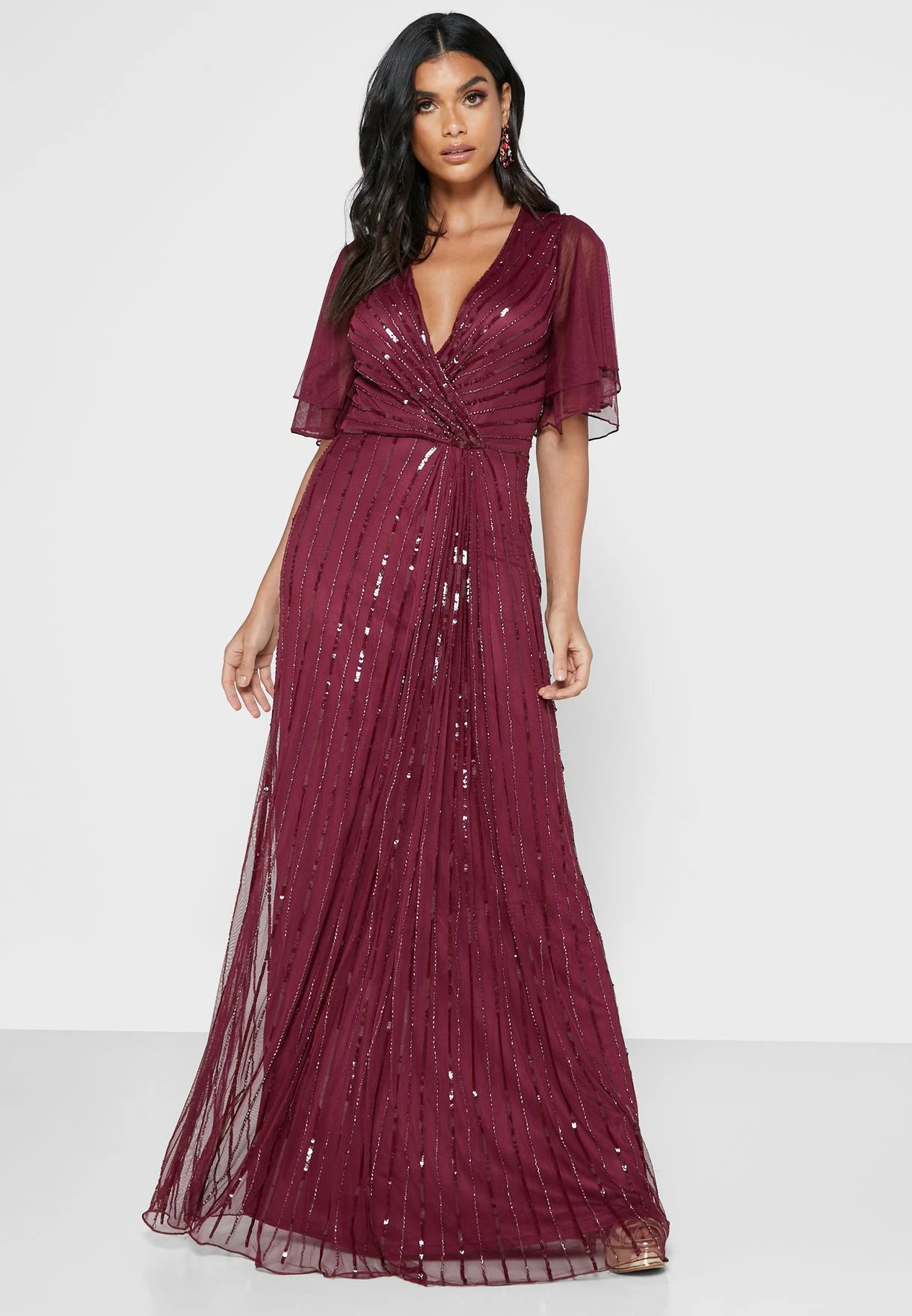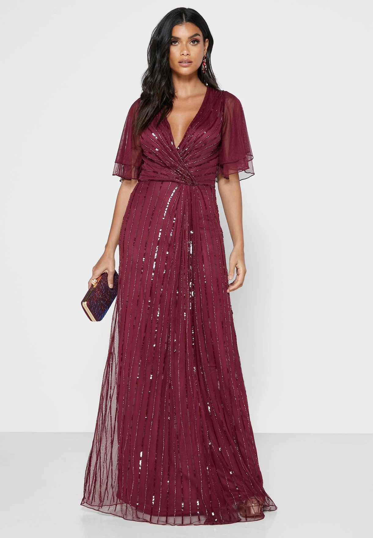 - Wrap front V-Neck and sheer layered angel sleeves