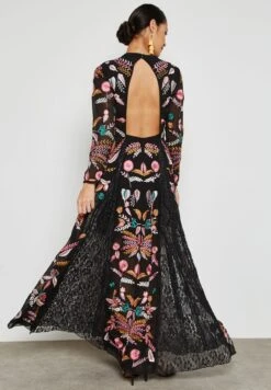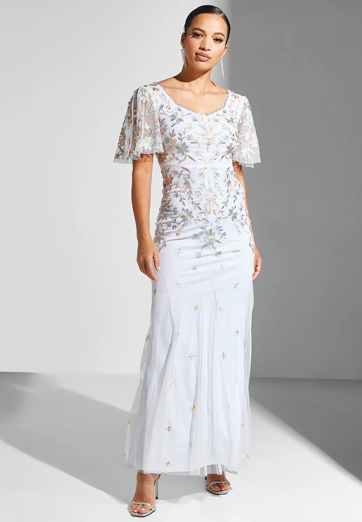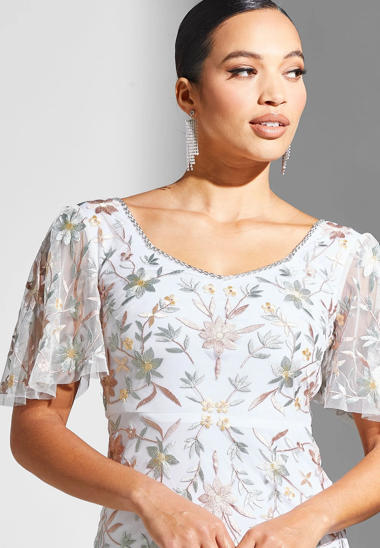 This flattering floral embroidered dress is intended for glamorous occasions and portrays an elegantly feminine aesthetic.
