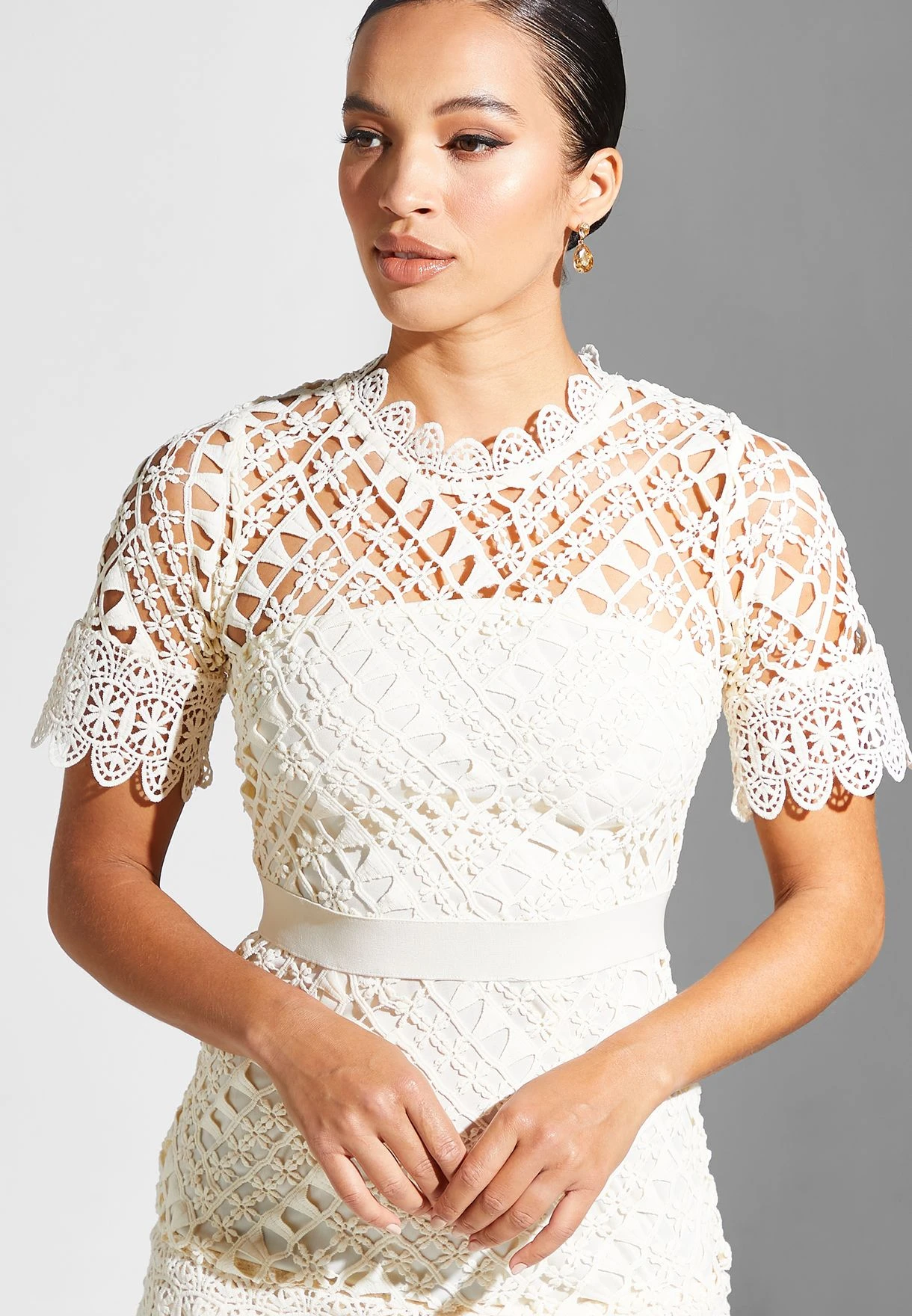 This flattering floral embroidered dress is intended for glamorous occasions and portrays an elegantly feminine aesthetic.