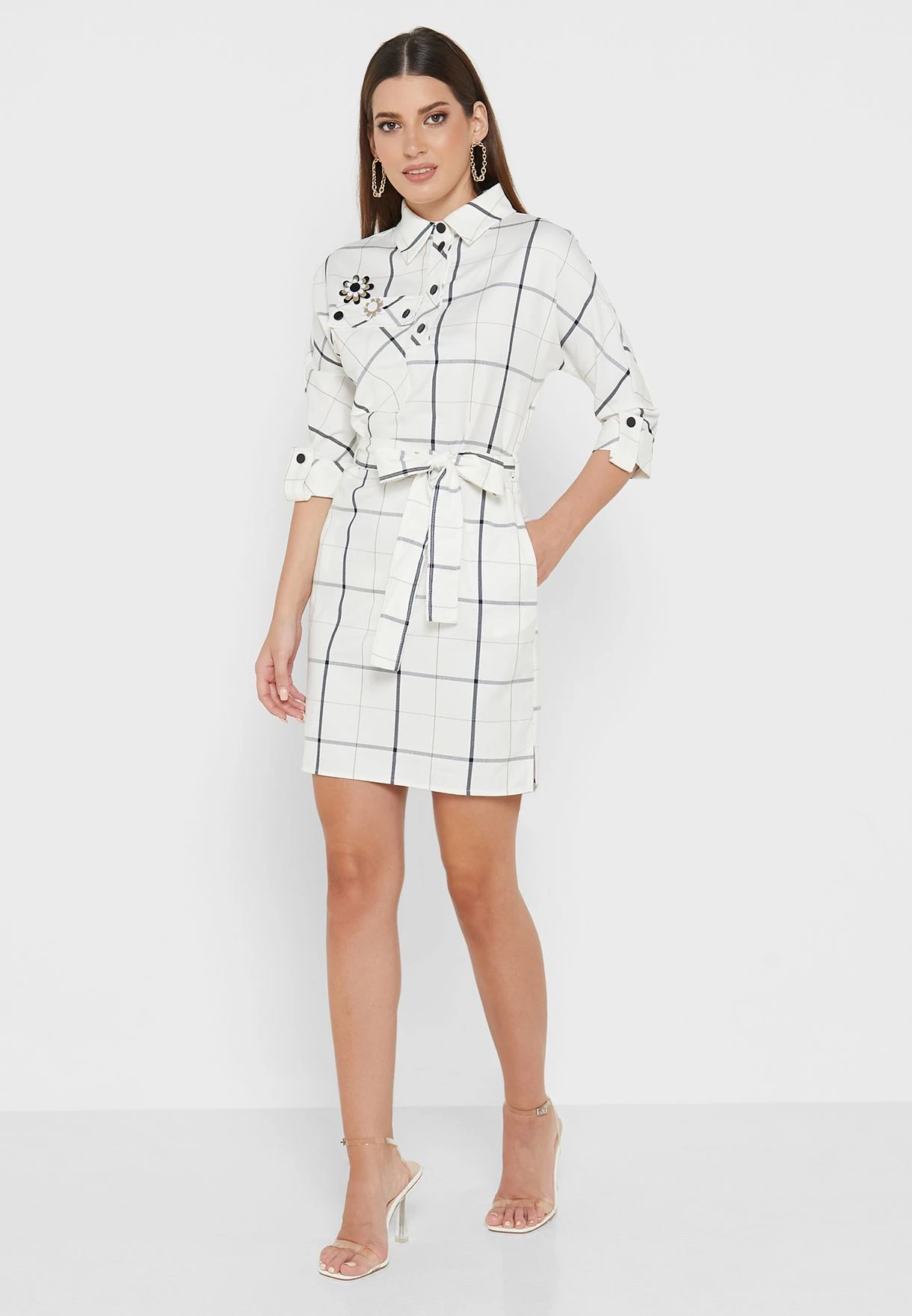 Checked Belted Button Detail Dress