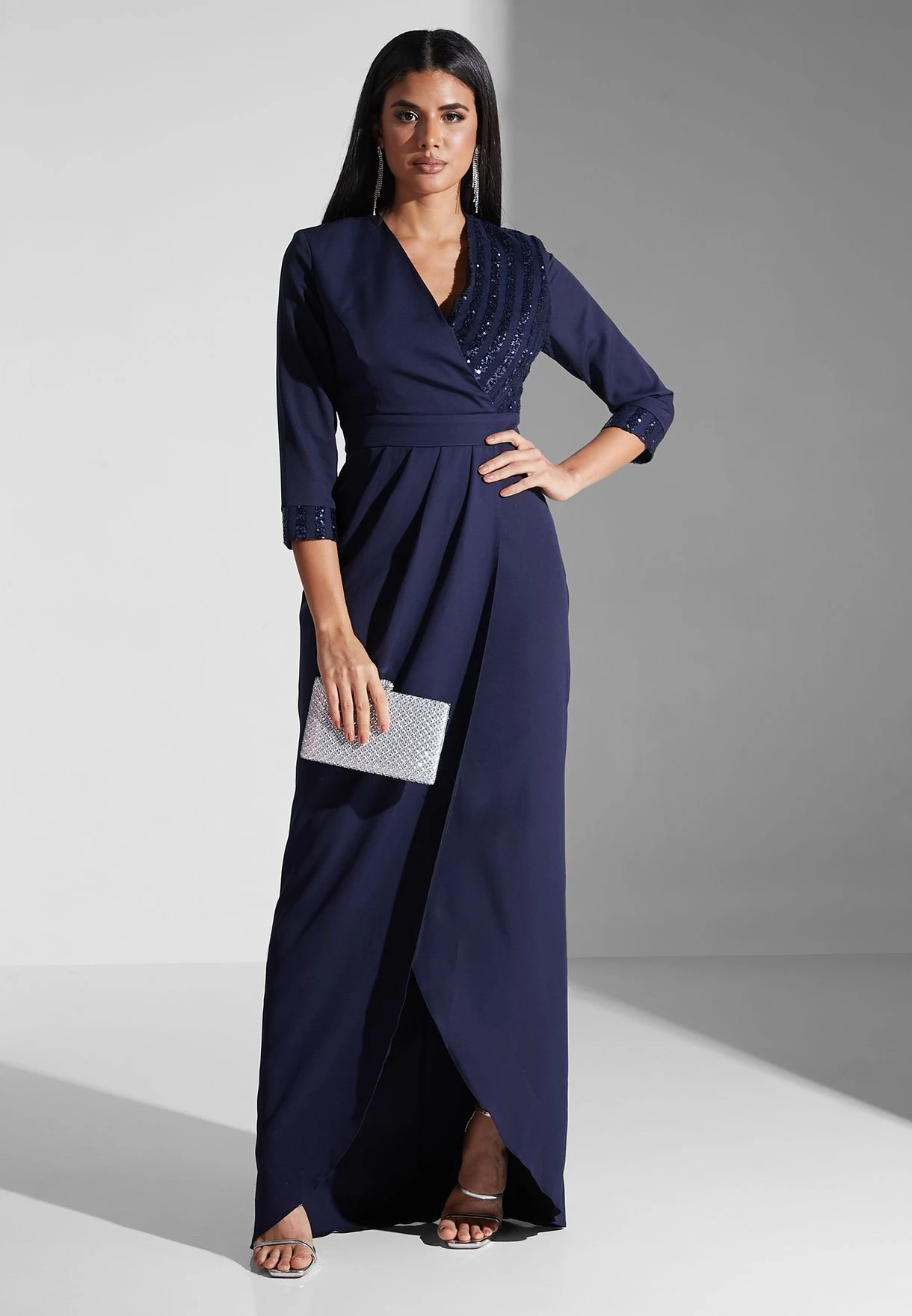 Give occasion dressing a new-age punch in this mock wrap dress. This outfit spells fierce finery.