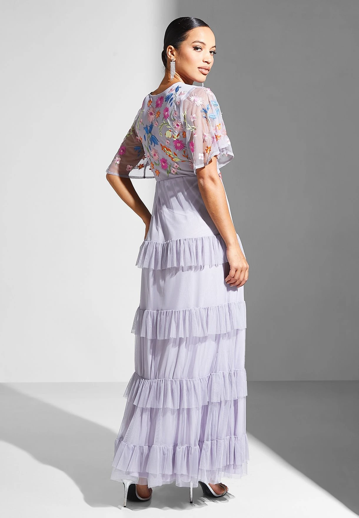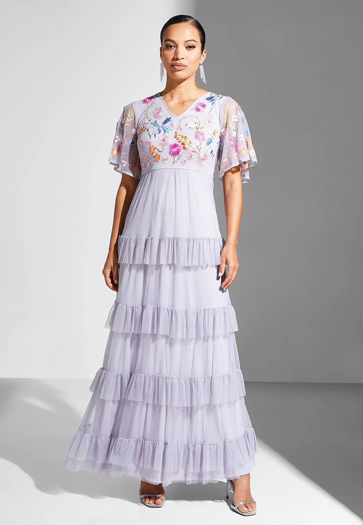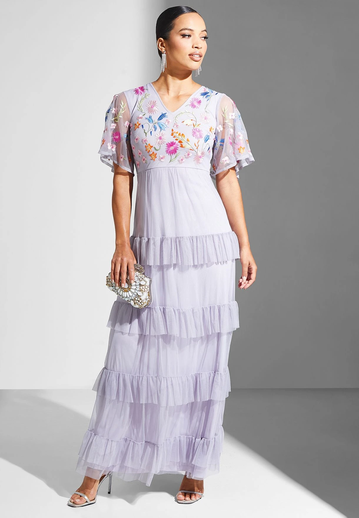 This flattering floral embroidered dress is intended for glamorous occasions and portrays an elegantly feminine aesthetic.