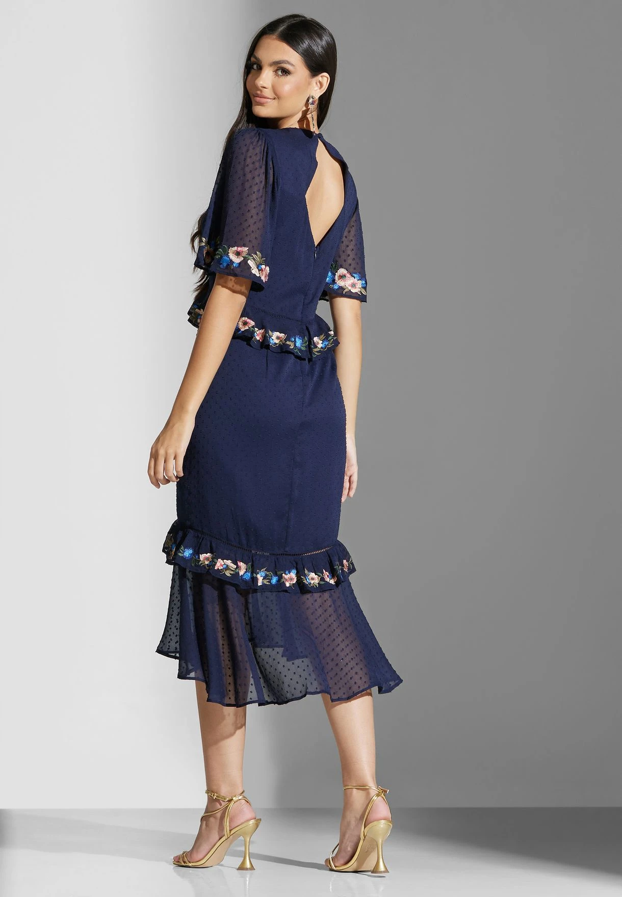 Embroidered Ruffle Hem Back Cut Dress