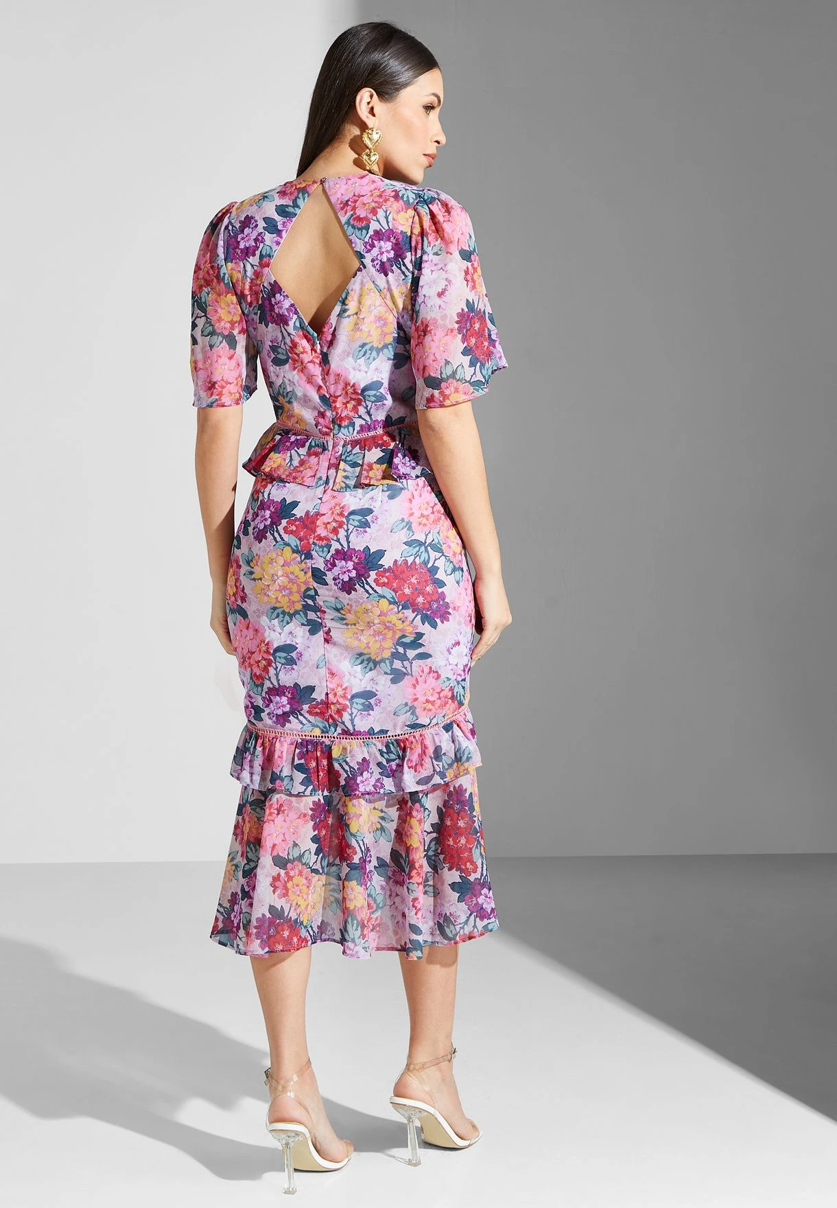Floral Back Cut Ruffle Hem Dress