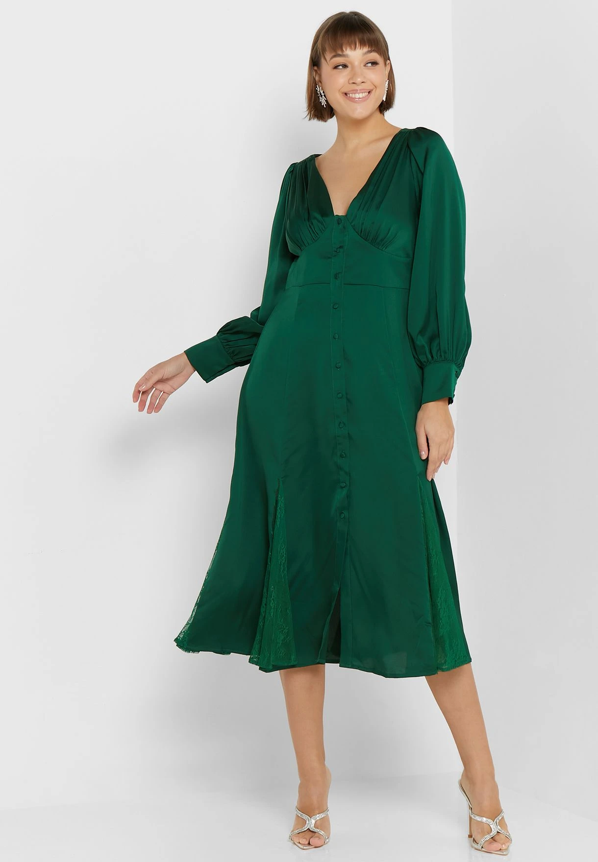 Little Mistress Plunge Neck Button Puff Sleeve Dress