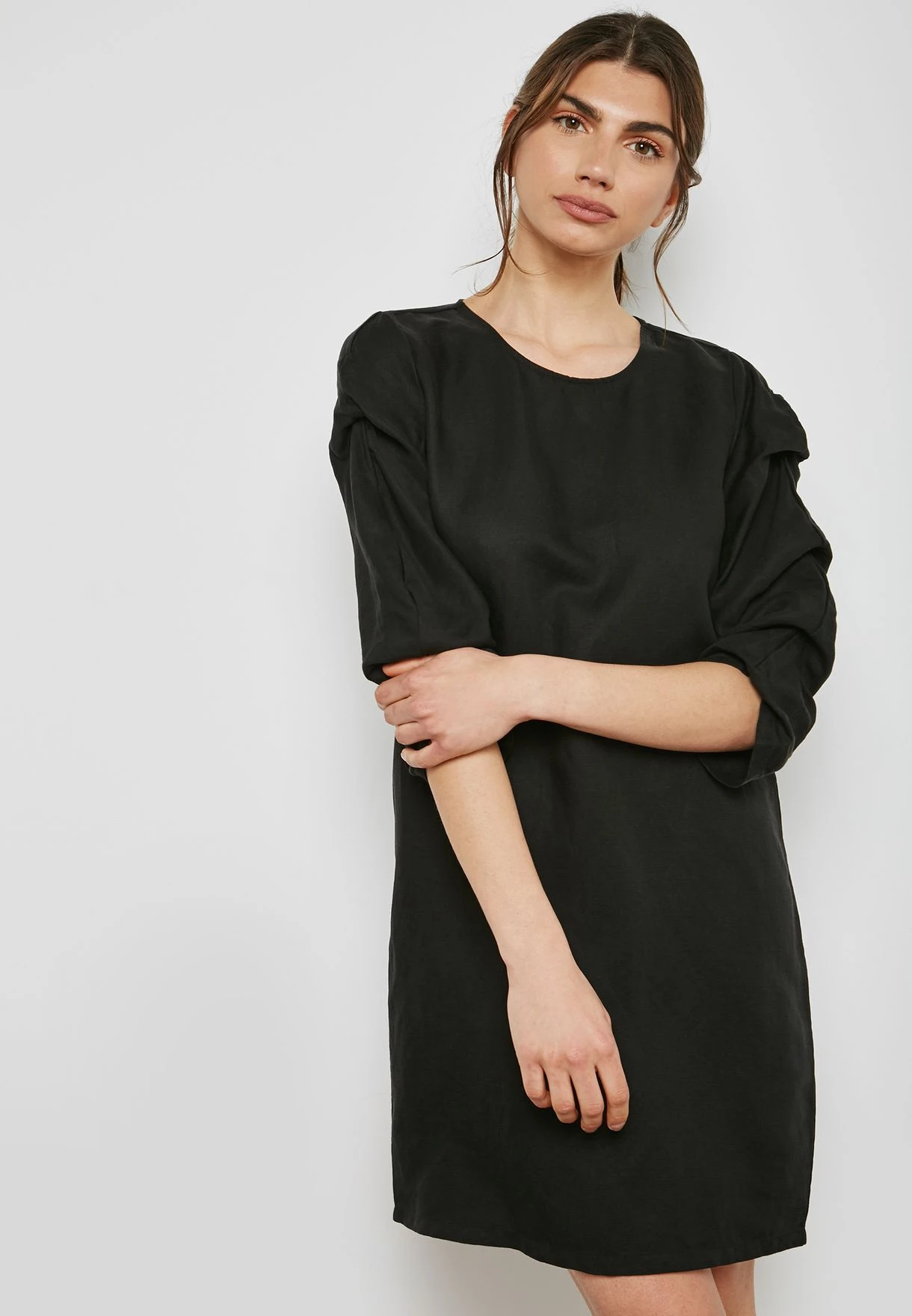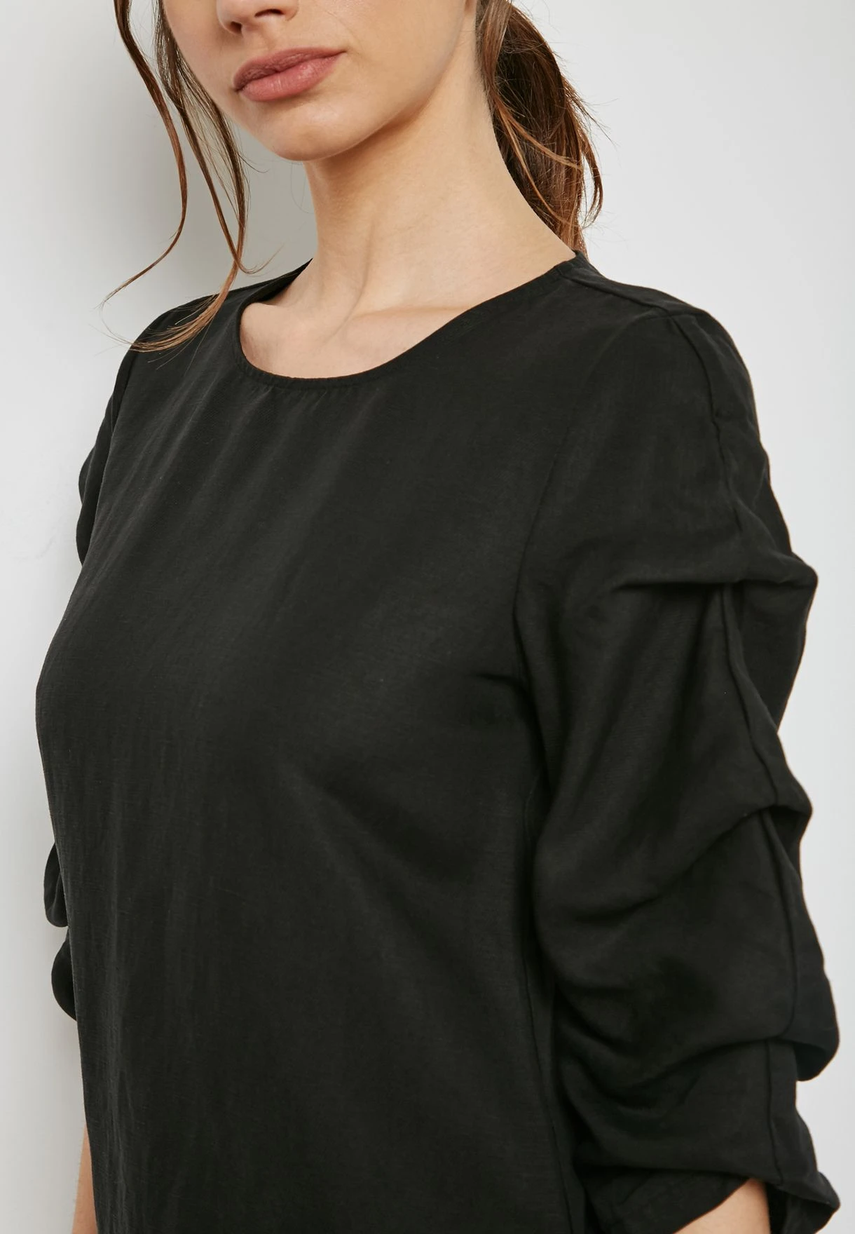 - Round neck and three-quarter ruched sleeves