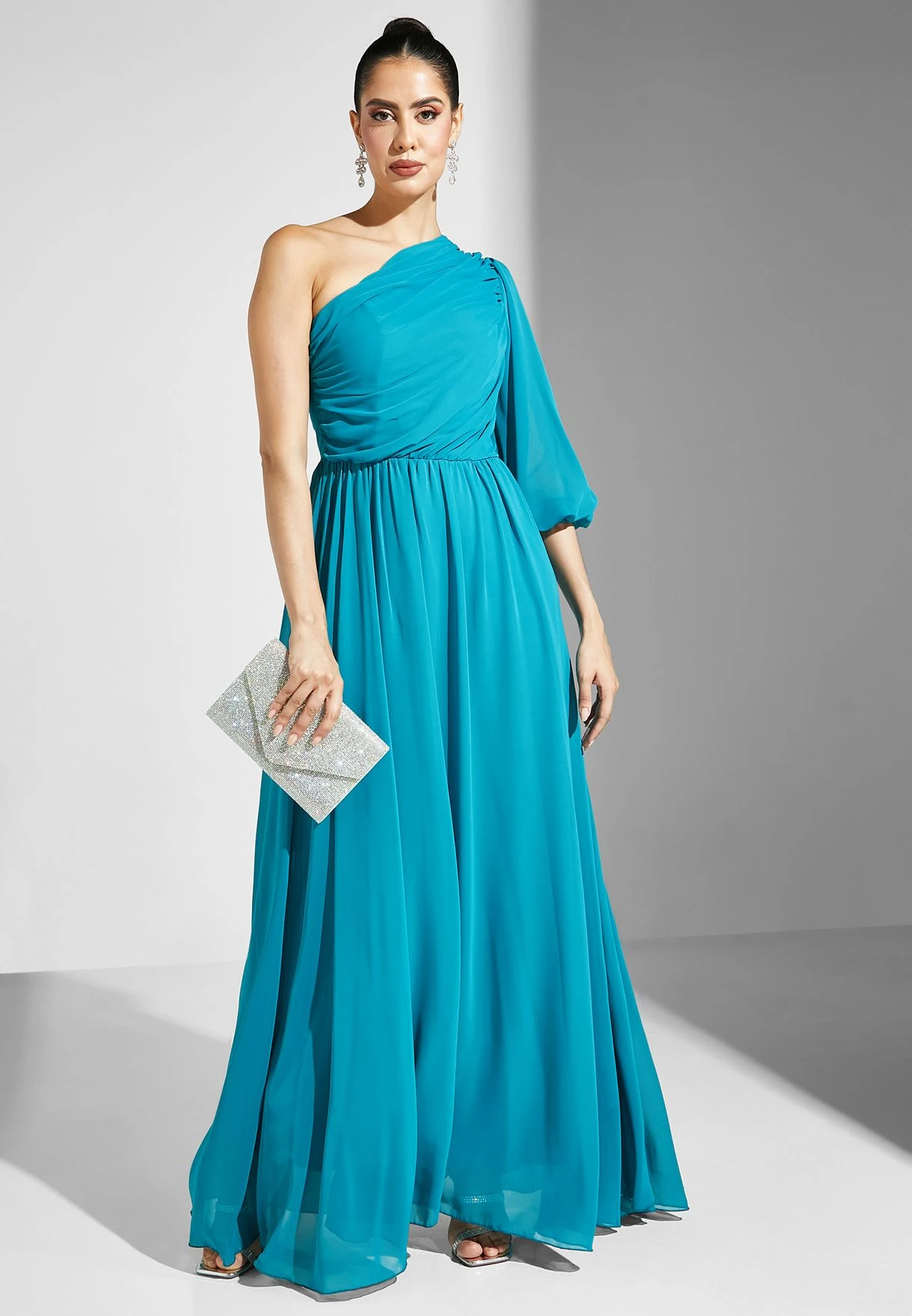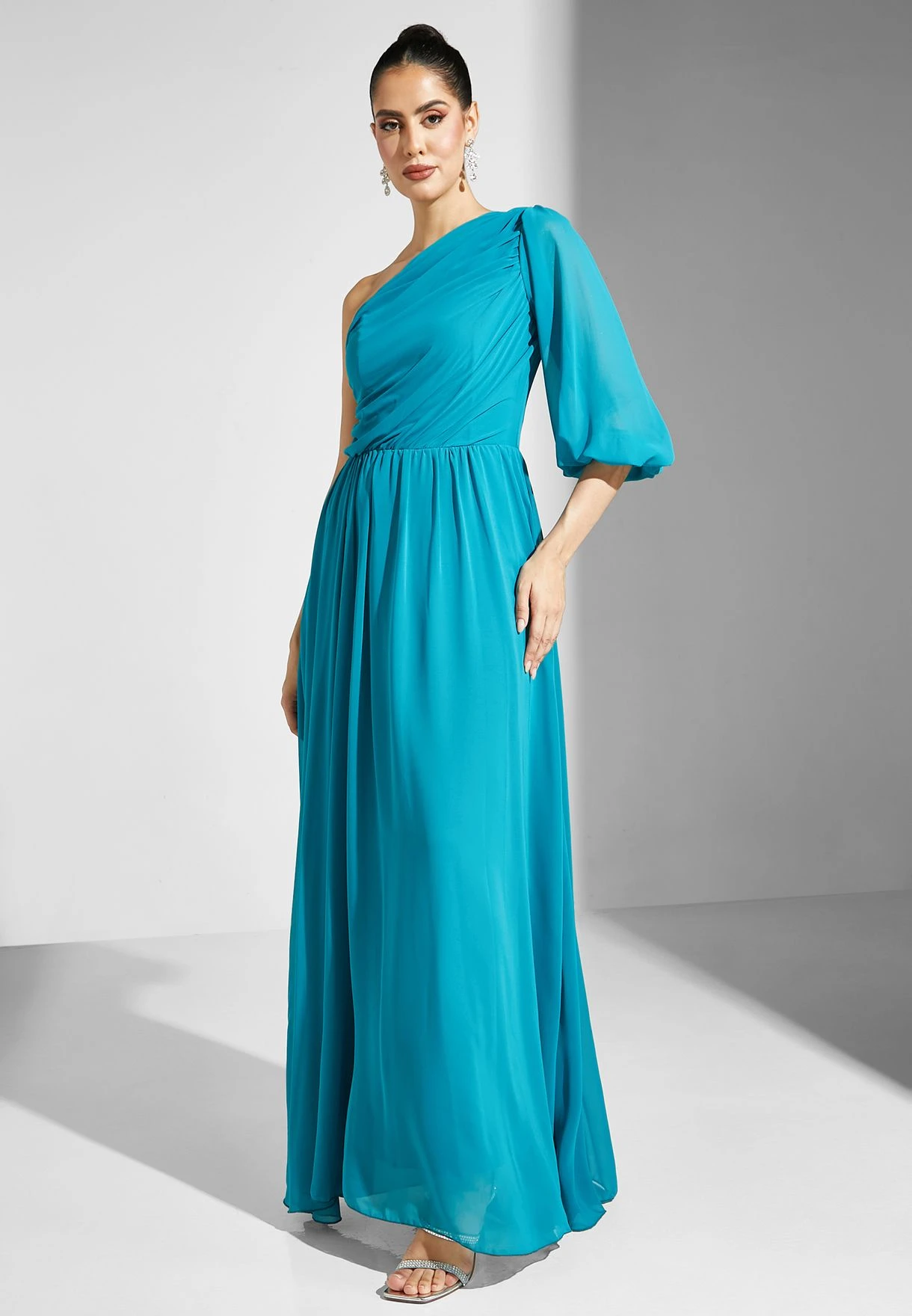 This flattering one -shoulder dress is intended for glamorous occasions and portrays an elegantly feminine aesthetic.