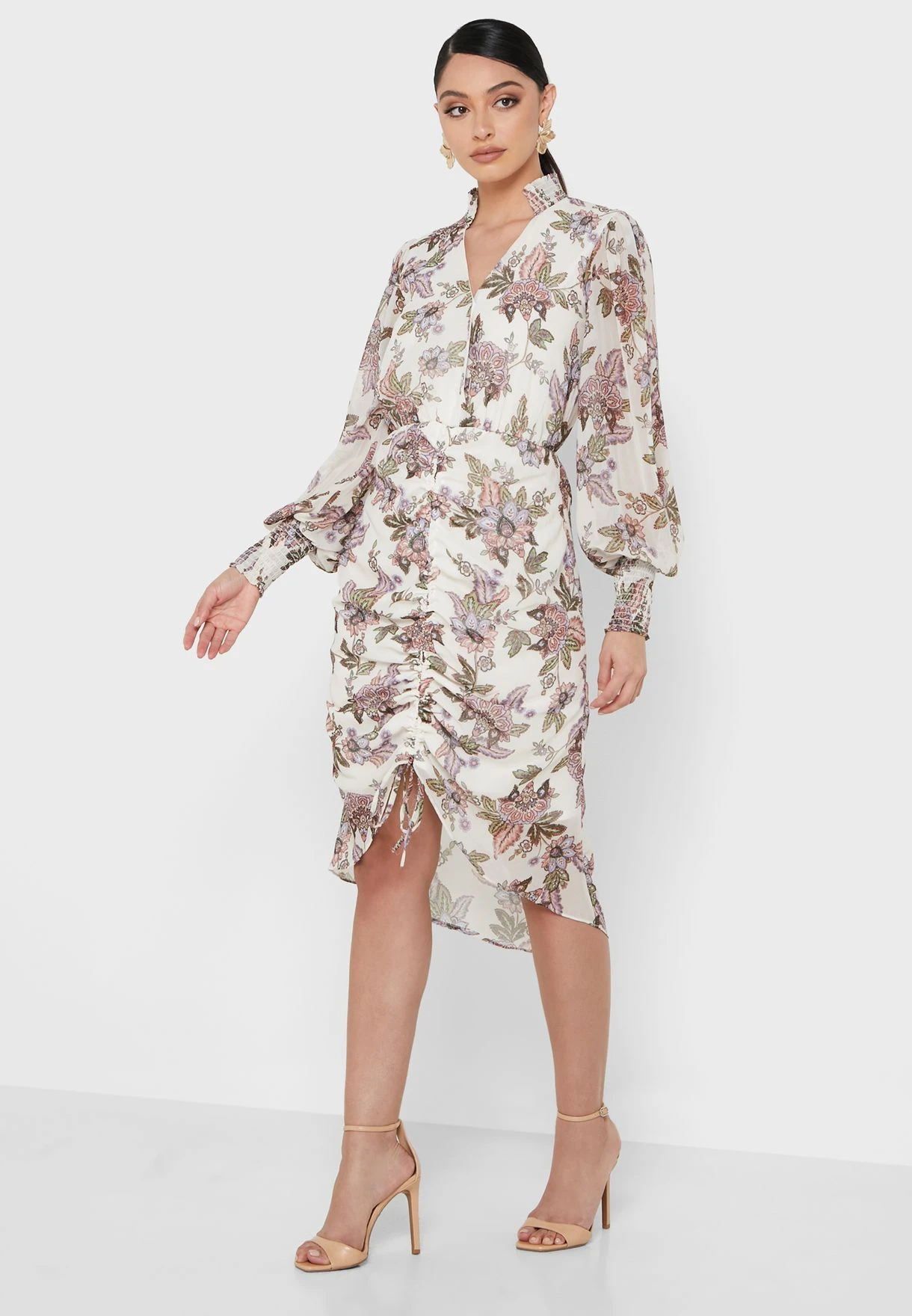 Plunge Neck Balloon Sleeve Printed Ruched Dress