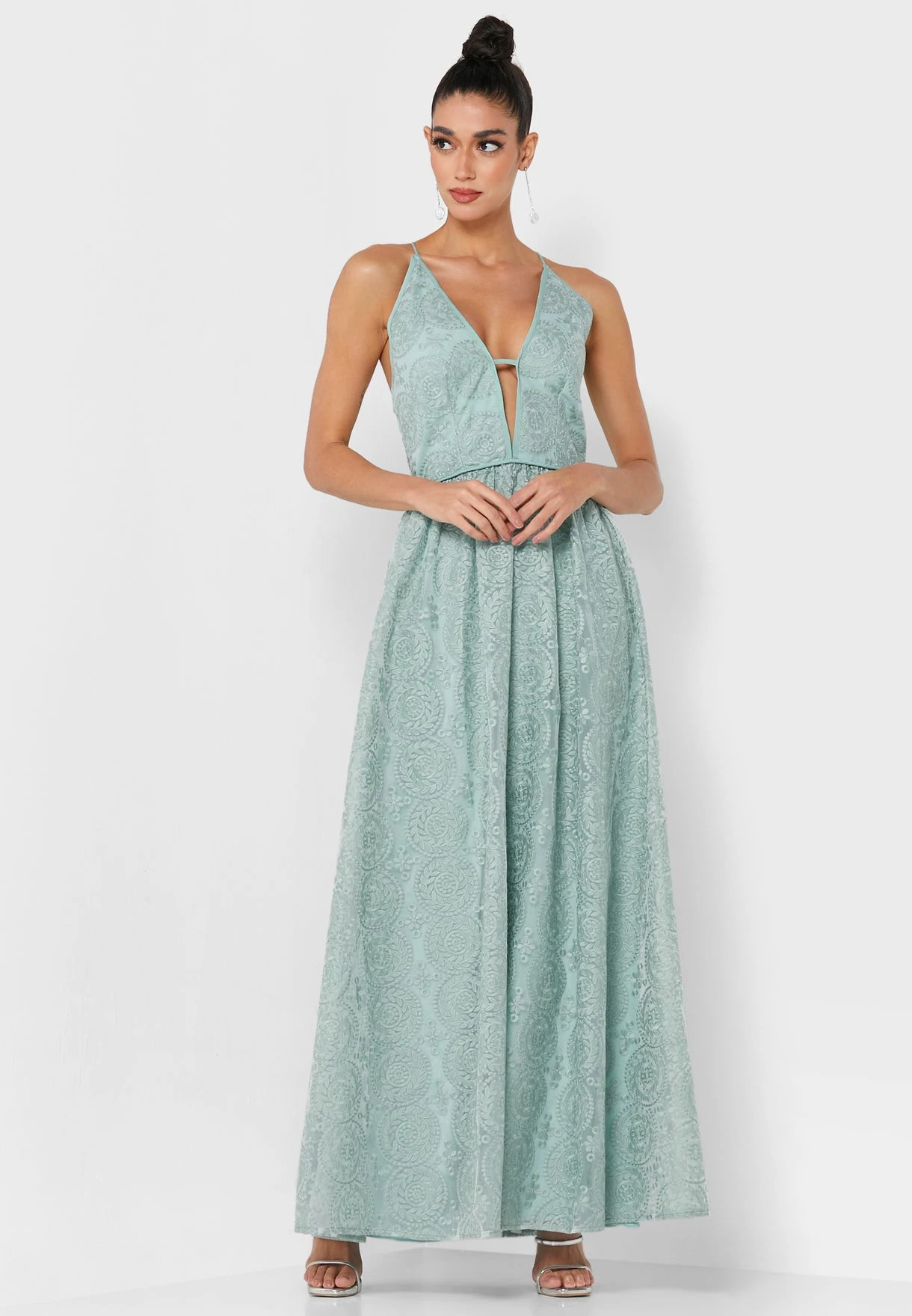 Plunge Neck Strappy Mesh Detail Embroidered Dress