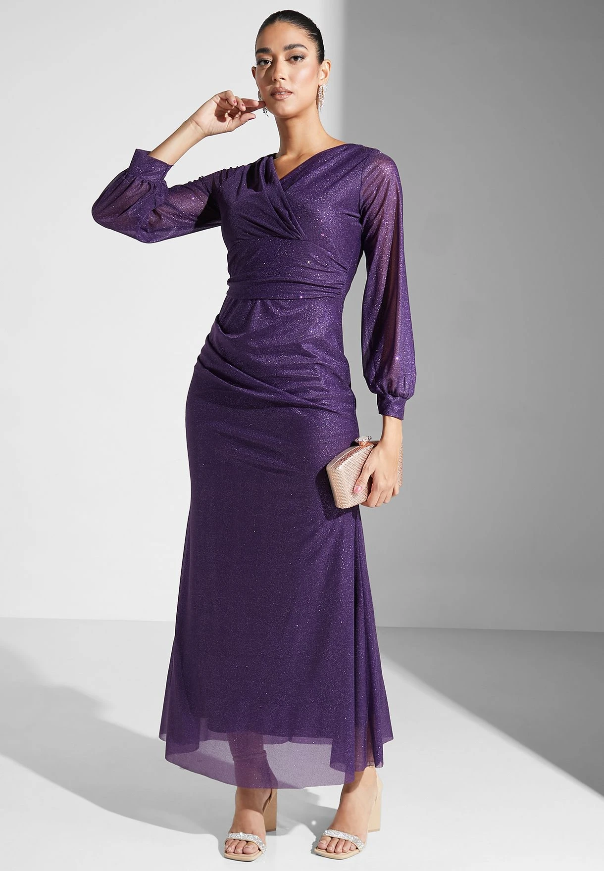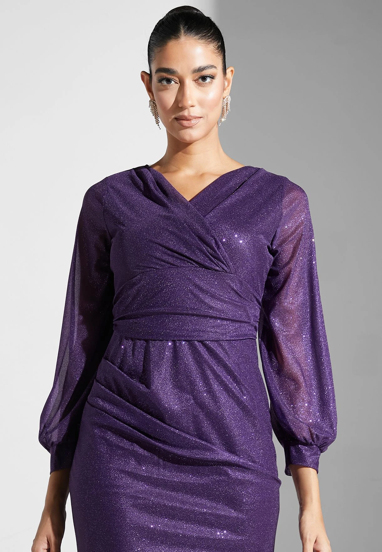 This flattering shimmery bodycon dress is intended for glamorous occasions and portrays an elegantly feminine aesthetic.