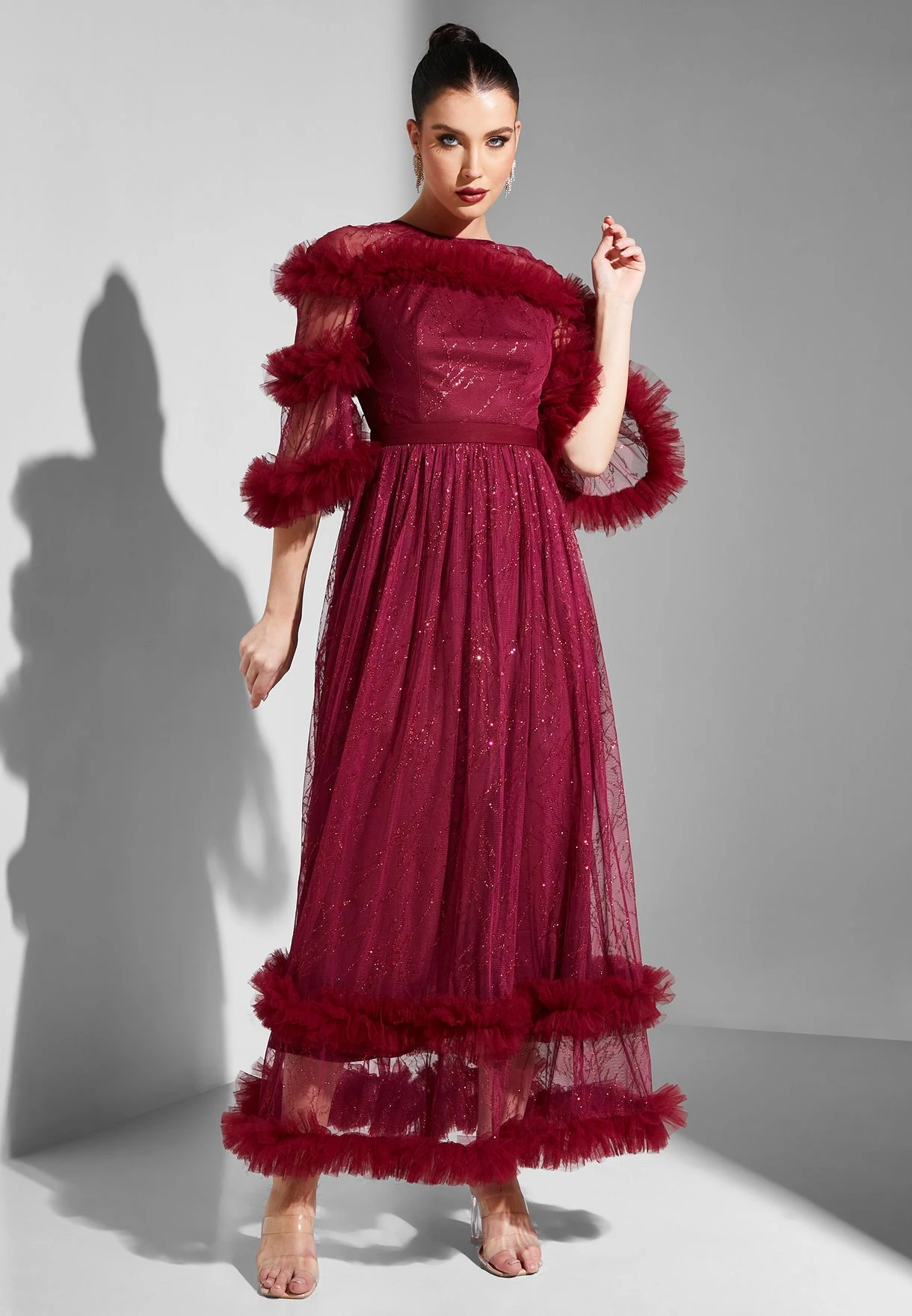 The flattering design of this dress is intended for glamorous occasions and portrays an elegantly feminine aesthetic.
