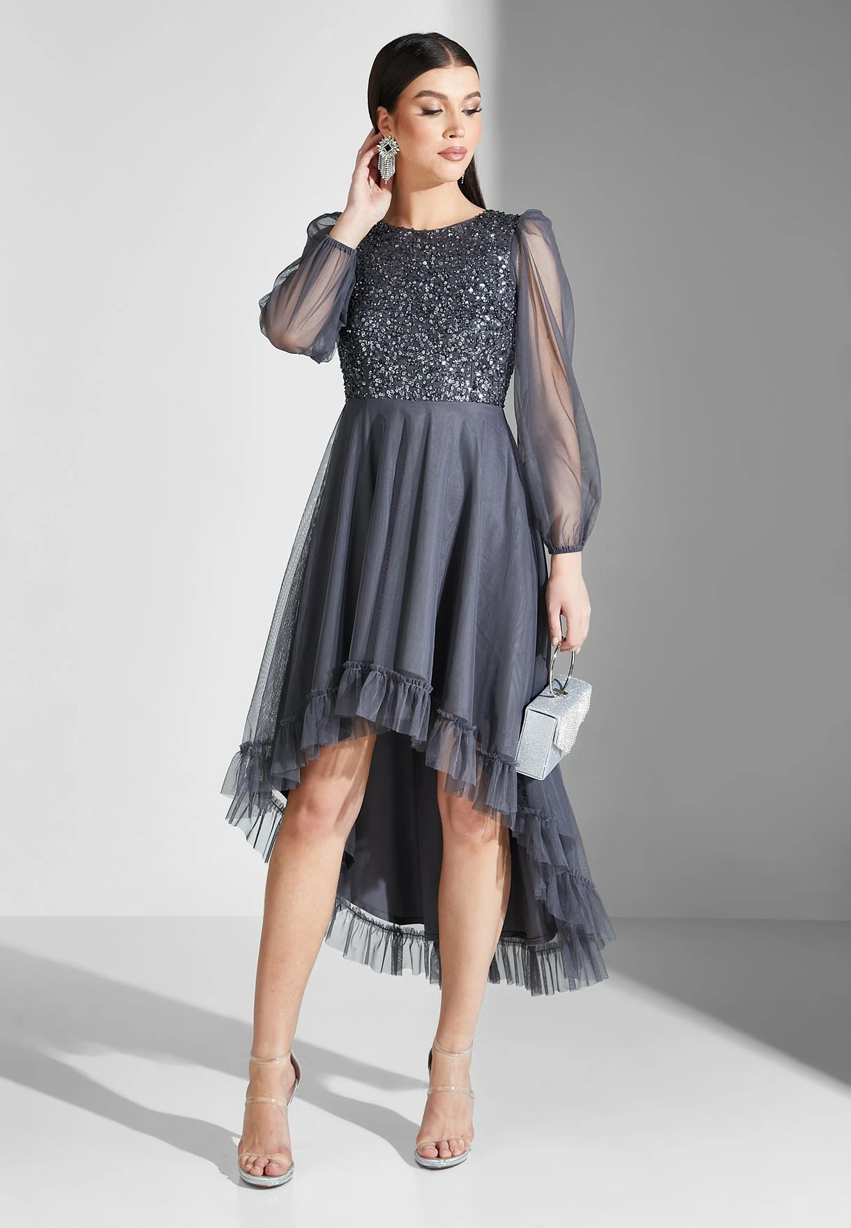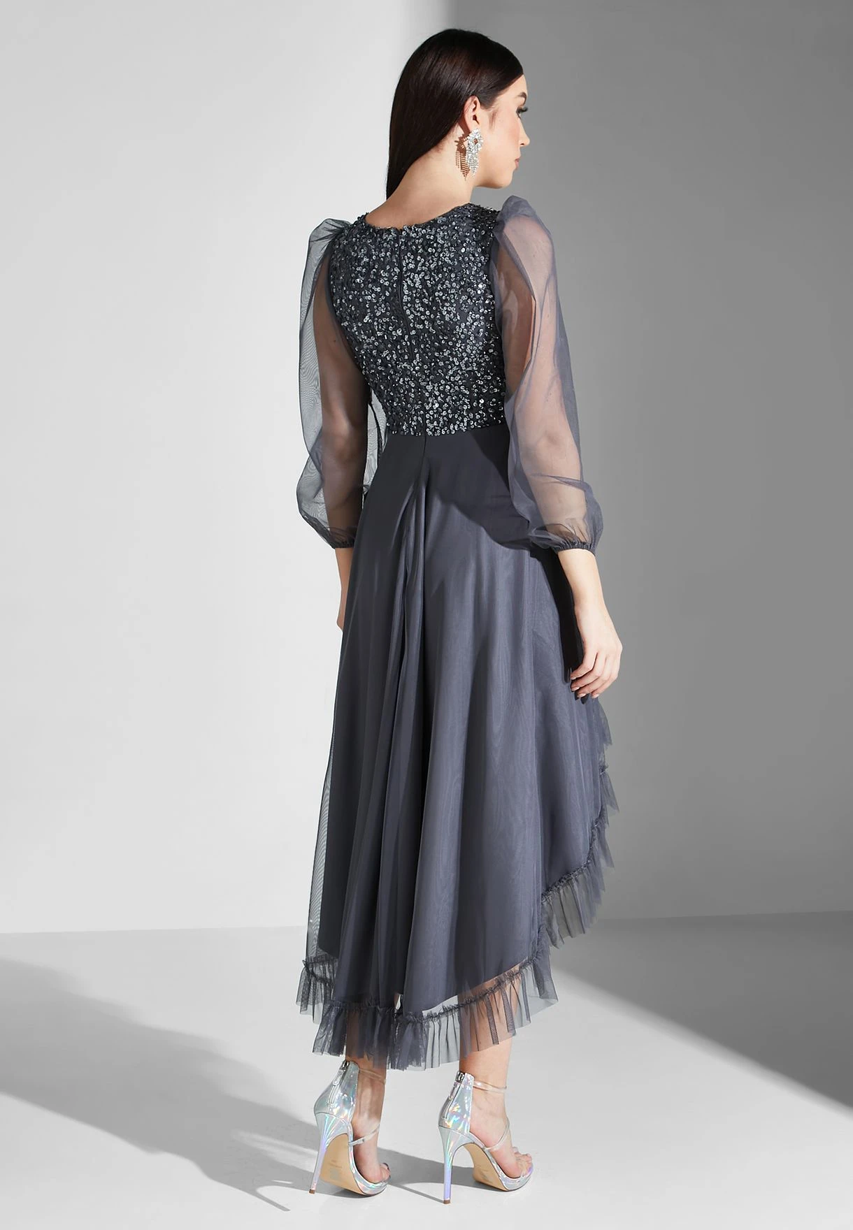 Sequin Plisse Puff Sleeve Dress
