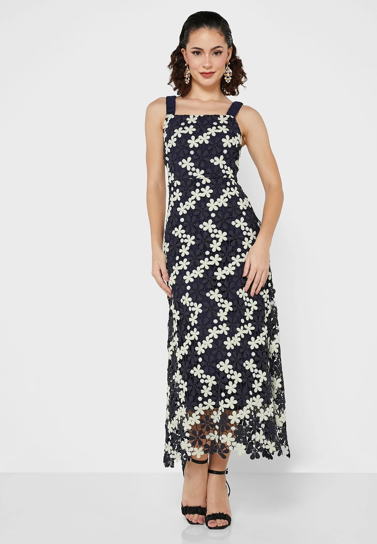 This embroidered floral dress is intended for glamorous occasions and portrays an elegantly feminine aesthetic.